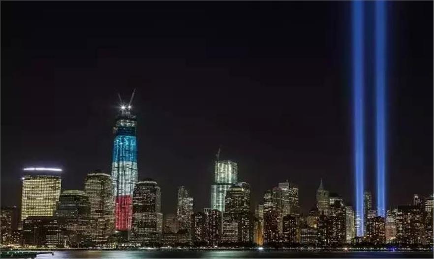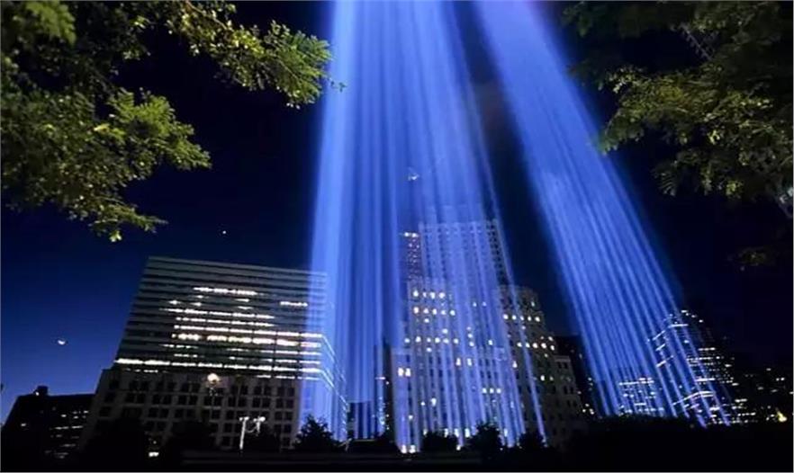 每到夜晚時分,紀(jì)念911的「紀(jì)念之光」(Tribute in Lights)藍(lán)色光柱從世貿(mào)遺址附近射向曼哈頓的夜空,象征著在911事件中消失的紐約市世界貿(mào)易中心雙子星永遠(yuǎn)屹立。