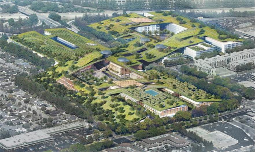 該項(xiàng)目位于硅谷的中心地帶,與蘋果二號(hào)園區(qū)相鄰,這個(gè)三十億美元的開發(fā)項(xiàng)目包括滿布零售點(diǎn)的街區(qū)、辦公室和休閑空間。在這之上,巨大的綠色屋頂集成了30英畝的公園供居民與到訪的游客使用。