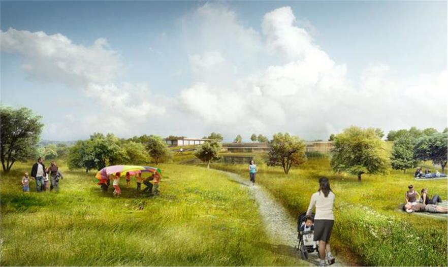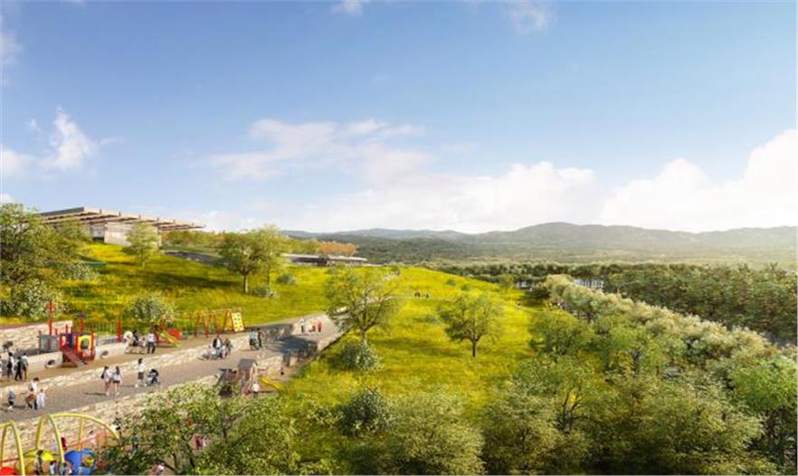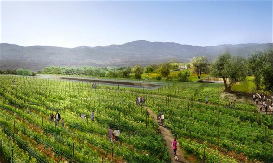 這個(gè)巨大區(qū)域結(jié)合用于慢跑和散步用的3.8英里小徑,并點(diǎn)綴有葡萄園、果園和有機(jī)花園。一個(gè)公共露天劇場坐落于兒童游樂區(qū)和用于(保護(hù))本地植物與鳥類的庇護(hù)所側(cè)邊。從環(huán)境保護(hù)的角度來看,該方案保存了現(xiàn)有的健康樹木,并額外種植本地植被和耐旱植物。