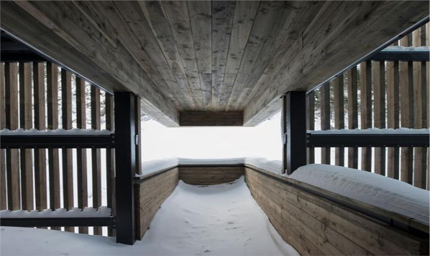 技術(shù)—— 木制板條系統(tǒng)不單單使得圍繞的旅游步道和水電站結(jié)合,而且還能過濾自然光,使夏季期間避免高溫。木制板條產(chǎn)生的陰影游戲,有著另人難以置信的效果,增添了場(chǎng)地的獨(dú)特感官體驗(yàn)。