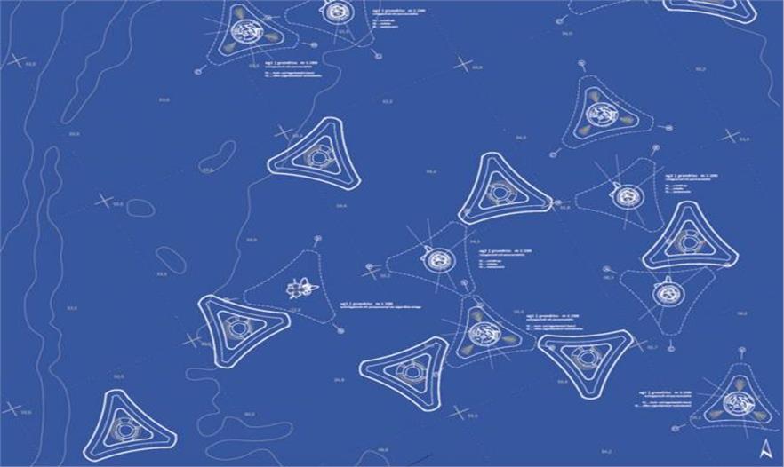 每一個(gè)“treibtgut”都會(huì)在頂端擠出一個(gè)三角形,并保持這部分漂浮在水面上,三角形的下面裝有一條用于保持穩(wěn)定性的尾巴。這些結(jié)構(gòu)單元隨著海洋潮汐和海浪漂移,彼此之間以位于側(cè)面的掛鉤和緩沖泊塢相連接。它們還配備有一個(gè)用于脫離連接和隔開(kāi)的反撥裝置。當(dāng)這些單元開(kāi)始連接或者彼此分離時(shí),它們不同的排列組合形式,或者說(shuō)是不同的都市景觀便會(huì)顯現(xiàn)于水面上。
