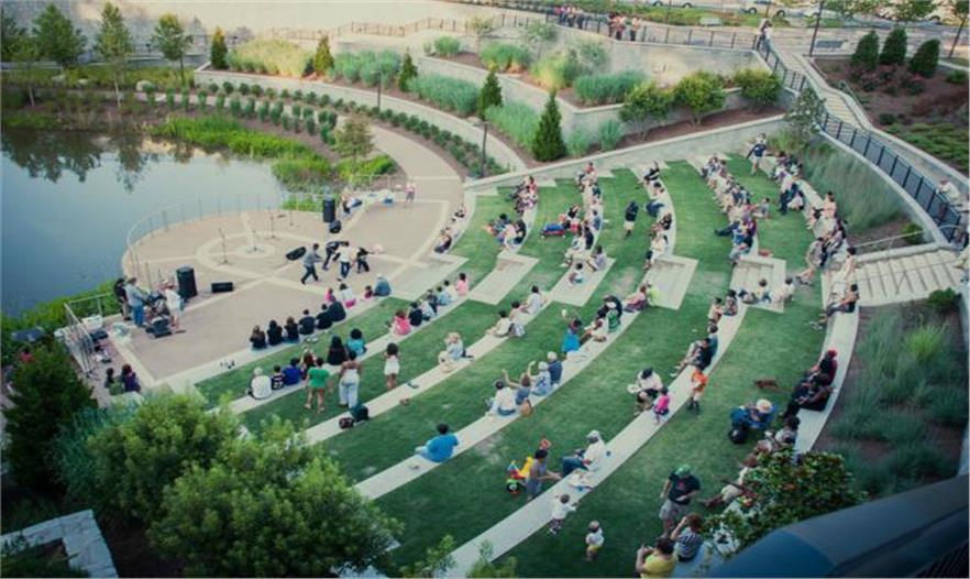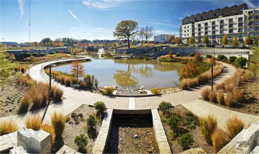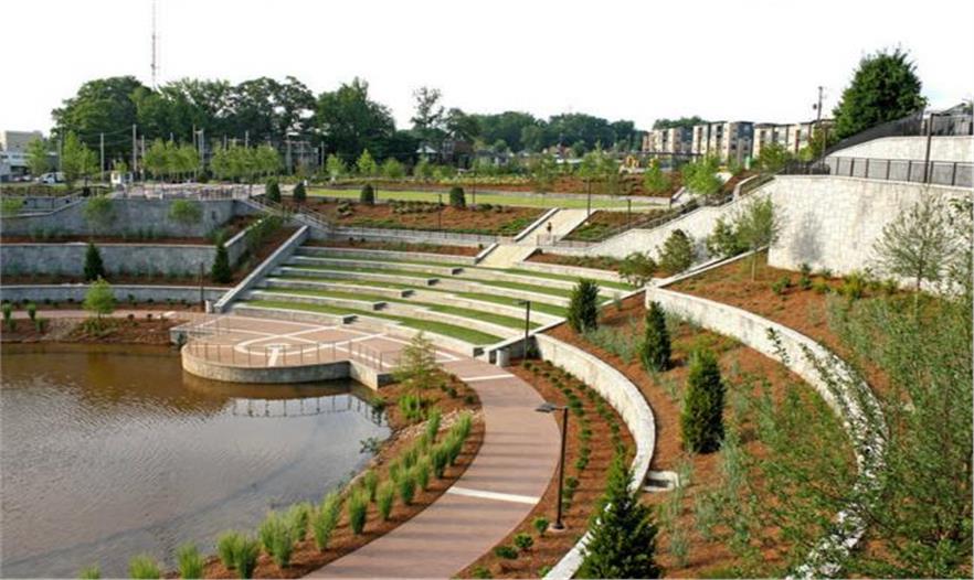 他們需要一起在城市中工作,共同提出一個解決城市徑流問題的方案,同時解決居民生活質(zhì)量、環(huán)境可持續(xù)、經(jīng)濟效益等問題。Historic Fourth Ward公園為城市提供了大約17英畝的綠地,具備各種便利的設施供大家使用。主要部分包括開放和封閉的草坪、運動場地、室外劇場、2英畝的湖泊,第二階段則具有世界級的滑板公園、另一個神話般的游樂場和一個大型多功能運動場。