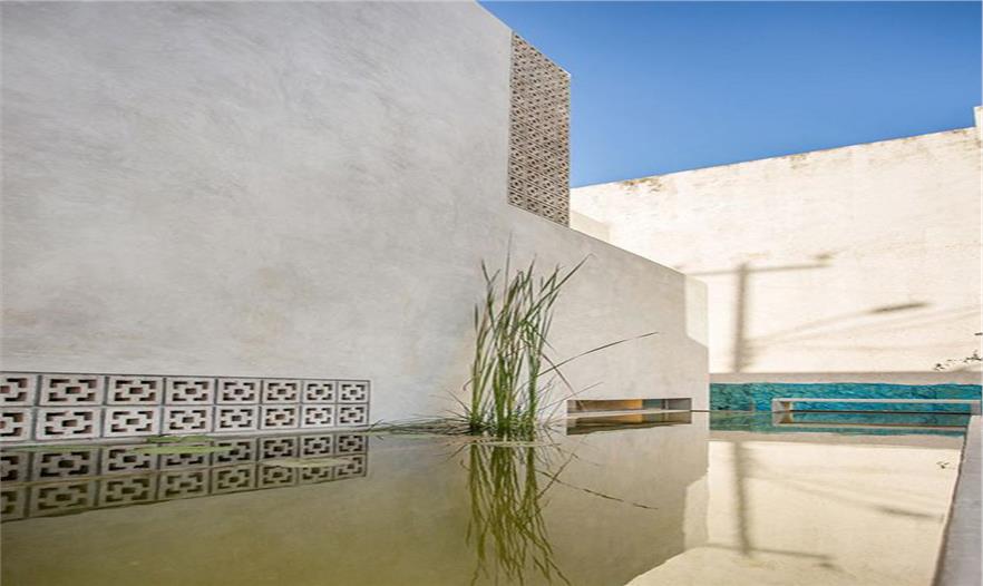 水元素充斥在住宅的內(nèi)部和前方區(qū)域,使住宅與自然建立了視覺上的聯(lián)系。住宅采用混凝土砌磚建造,可以自然的保持室內(nèi)溫度舒適且通風(fēng),住宅低矮的屋頂采用聚苯乙烯板隔熱。