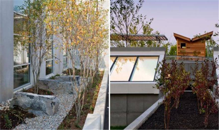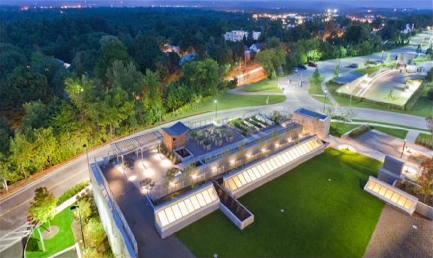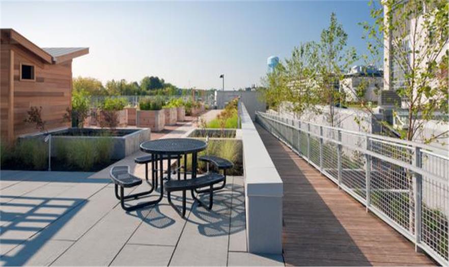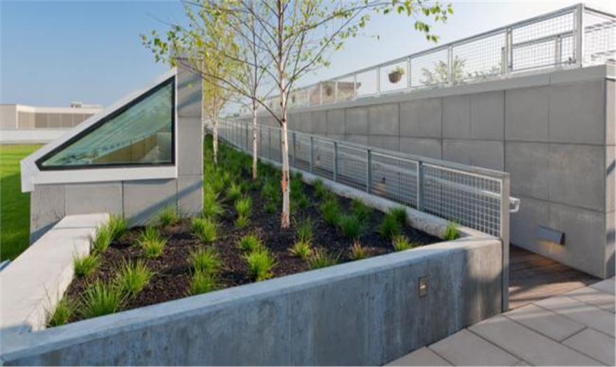 佛蒙特大學(xué)醫(yī)藥中心放射腫瘤科的屋頂花園是個(gè)可持續(xù)發(fā)展的花園,供公眾休閑娛樂(lè)使用。其設(shè)計(jì)概念吸收佛蒙特農(nóng)場(chǎng)、草地和村莊的空中形態(tài)。作為一個(gè)屋頂花園,它能幫助減少雨水徑流。該方案的特色是草地、草坪、菜園和廣場(chǎng)。綠色屋頂和菜園是區(qū)域發(fā)展的創(chuàng)新模式,利用屋頂種植新鮮的蔬菜,供應(yīng)醫(yī)院的餐飲部。菜園還是治療和教育工具,讓這個(gè)中心的病患學(xué)習(xí)關(guān)于營(yíng)養(yǎng)和健康植物生產(chǎn)的知識(shí)。該中心的北面是治愈花園,一個(gè)私人、寧?kù)o的思考空間,作為停車(chē)場(chǎng)和新建筑之間的過(guò)渡帶。該空間種有本土唐棣屬植物和蕨類(lèi)植物,引起人們對(duì)林地的回憶。廣場(chǎng)通過(guò)一個(gè)水景與東面相連,成為病患和員工的聚會(huì)空間。游客可以通過(guò)坡道進(jìn)入上面的陽(yáng)臺(tái)和菜園,坐下休息欣賞綠山的美景。