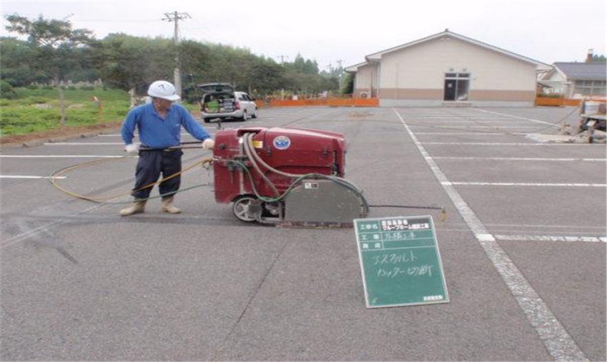 使用道路切割電鋸,進(jìn)行地基基坑位置,瀝青混凝土路面的切割作業(yè)