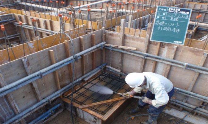 使用高壓水槍,進(jìn)行混凝土基礎(chǔ)澆注前的清掃處理