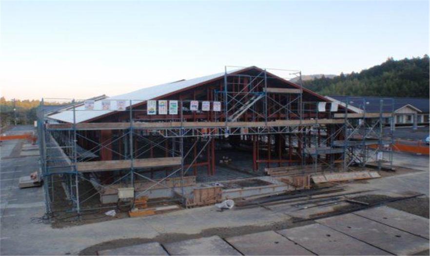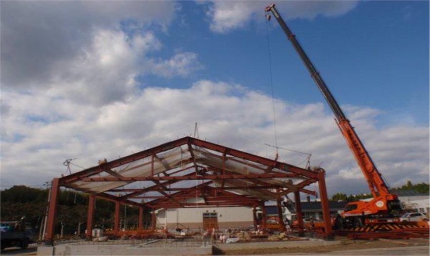 雙坡屋面單層鋼結(jié)構(gòu)承重框架,搭建施工現(xiàn)場(chǎng)全景