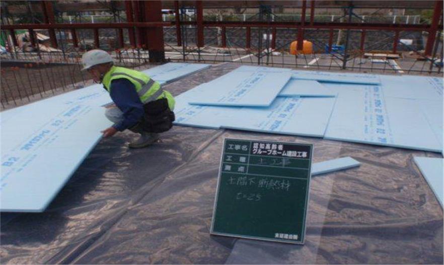 室內(nèi)地面,防水隔潮塑料薄膜的上部,鋪設(shè)一側(cè)淺藍(lán)色的厚度為2.5厘米的擠塑XPS聚苯乙烯泡沫保溫板