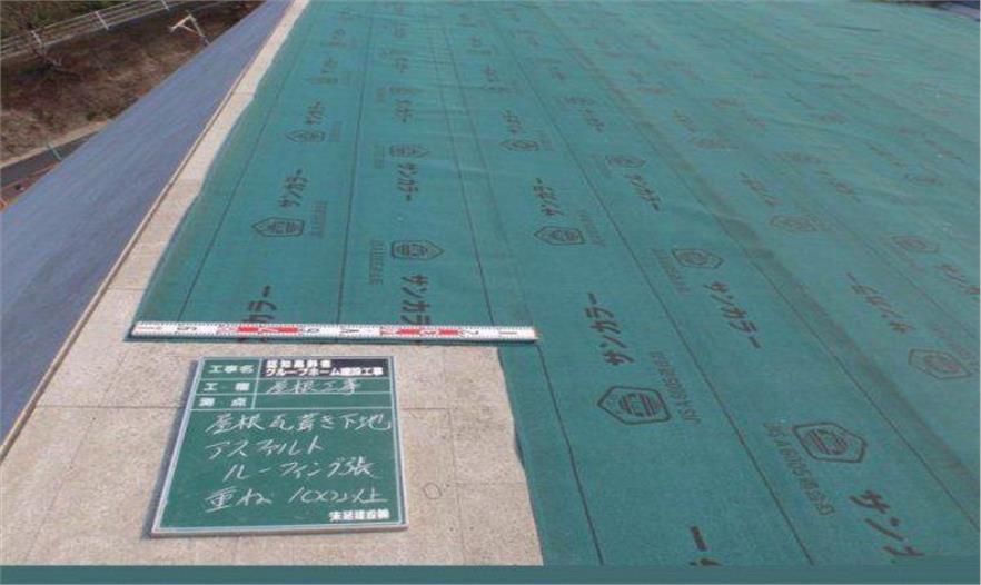 坡屋面上,縱向鋪設(shè)的瀝青材質(zhì)的優(yōu)質(zhì)油氈,為了保證迅速排水、防水效果,各幅之間,需要搭接一定的尺寸