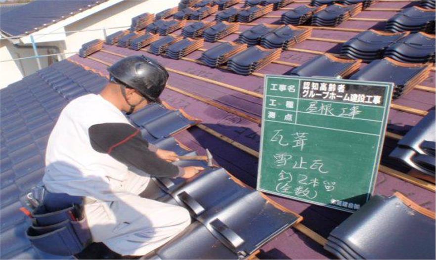 坡屋面上,粘土燒制瓦片,安裝固定施工現(xiàn)場(chǎng)