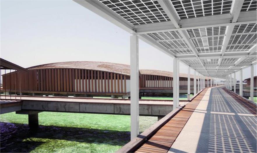 由總部位于紐約的建筑事務(wù)所Yuji Yamazaki Architecture PLLC設(shè)計(jì),與本地事務(wù)所Design2000合作,意大利工程事務(wù)所T&D Water Technologies,島嶼度假村可以容納100名客人。客人可以休息并享受赤道的陽光,他們也會看到太陽能是如何收集并應(yīng)用的。島嶼將近13畝,共有123000平方英尺室內(nèi)空間。確定了67000平方英尺的太陽能板,在平日能產(chǎn)生1兆瓦電能,供應(yīng)100名客人和100位員工使用。太陽能可以為客人看到,遍布全島,并整合到酒店設(shè)計(jì)的各個方面,成為點(diǎn)綴。在太陽能系統(tǒng)(包括電池和監(jiān)控系統(tǒng))的初期投資會在7到8年回收,因?yàn)闊o需進(jìn)口柴油。這應(yīng)該為其他有著類似天氣的國家提供了極好的案例。一個約200人的13畝小島,人口密度與邁阿密類似。從理論上講,如果邁阿密可以提供他們土地或者屋頂?shù)?2%用來鋪裝太陽能板,這個號稱陽光之州的最大的城市,將可以完全由太陽提供能源。
