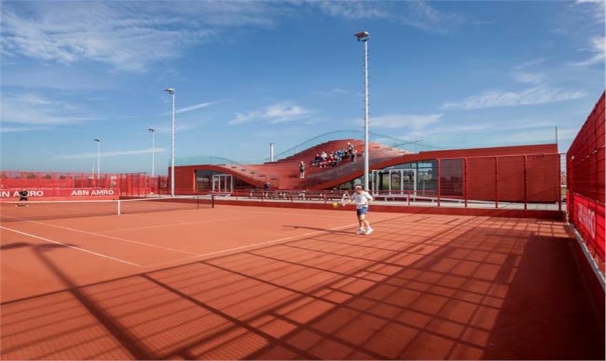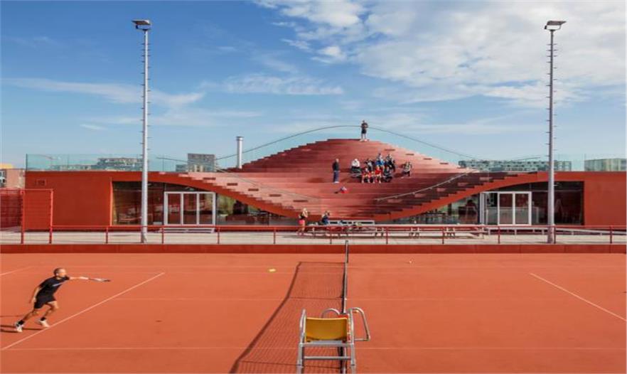 圍繞著6個(gè)人造島嶼,IJburg是位于阿姆斯特丹東部的新街區(qū)?,F(xiàn)在它已經(jīng)成為了1萬(wàn)6千居民的家。為了吸引更多人來(lái)到這個(gè)新興街區(qū),一系列配套正在完善中。其中一所剛成立的網(wǎng)球俱樂(lè)部揚(yáng)言建立10個(gè)紅土場(chǎng)并擁有自己的體育學(xué)院。這個(gè)雕塑般的俱樂(lè)部會(huì)所由荷蘭建筑事務(wù)所MVRDV設(shè)計(jì),焦點(diǎn)是復(fù)雜的“長(zhǎng)凳”。