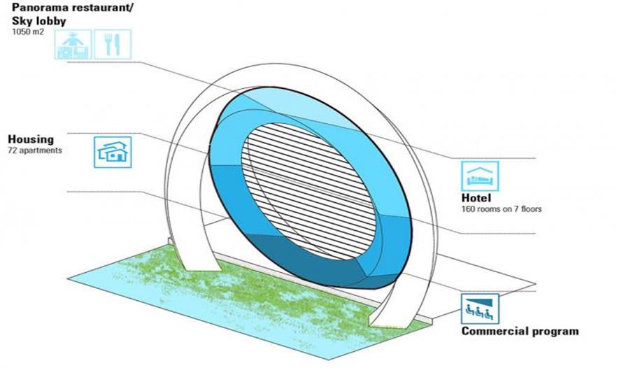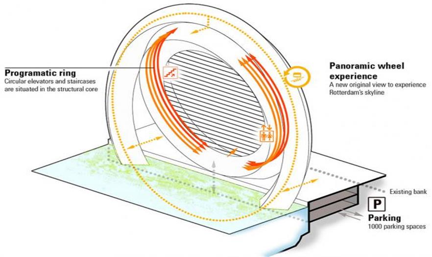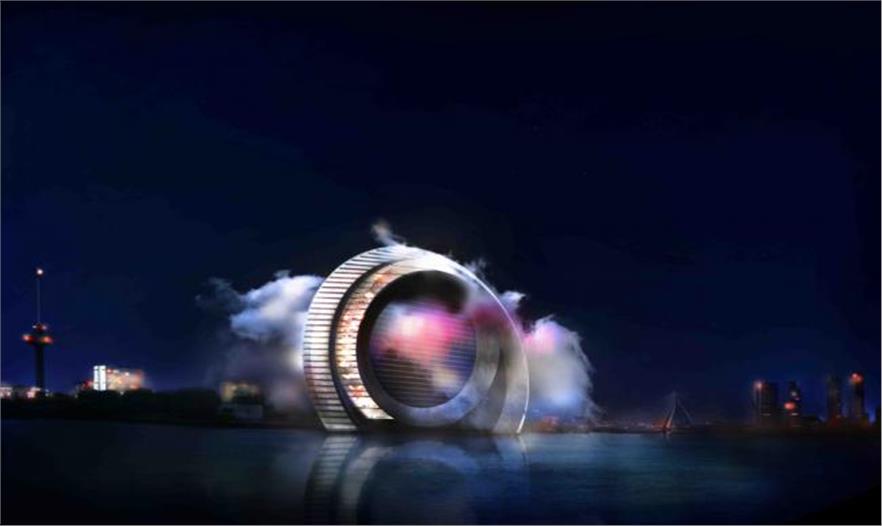 項(xiàng)目被稱作“世界上最具創(chuàng)新性的風(fēng)機(jī)”,荷蘭風(fēng)輪項(xiàng)目旨在成為鹿特丹河岸一大地標(biāo)。建筑結(jié)構(gòu)高達(dá)174米,兩個(gè)環(huán)形中的外環(huán)容納了40個(gè)過山車車廂,靜止的內(nèi)環(huán)涵蓋公寓、酒店和餐廳設(shè)施。