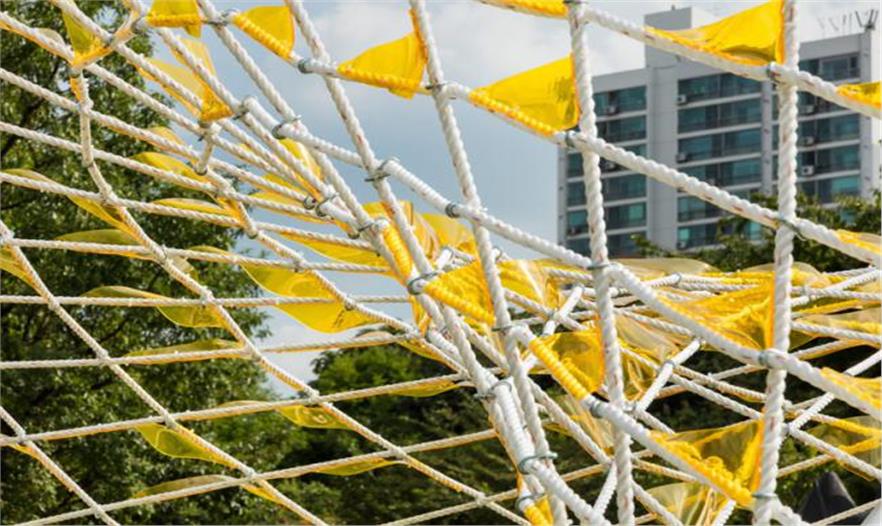 這些預裝的模塊要在場地進行兩天的組裝,之后安裝573米長的繩子,構成拓樸空間。最后,繩子覆上367個三角形聚氯乙烯裝置,提供紫外線防護。Dynamic Relaxation裝置的官方展覽延伸到10月,但是它將會永久地放置在該區(qū)域。