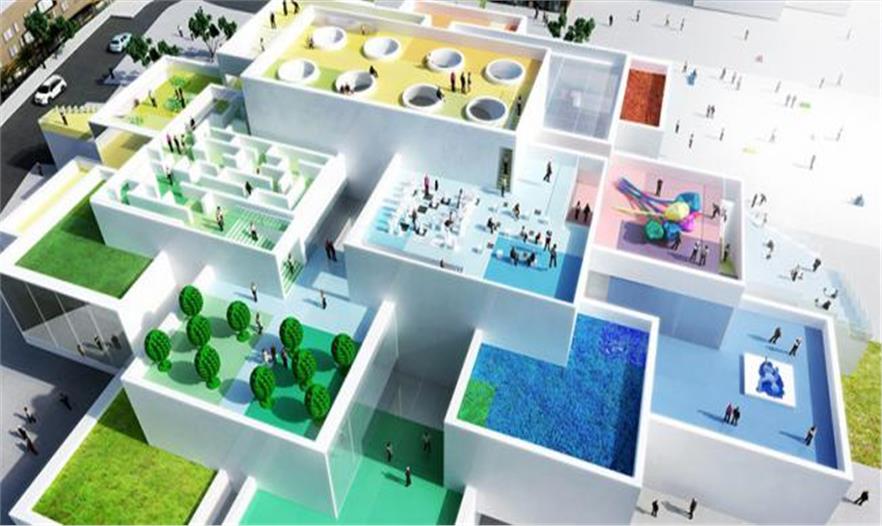 這個(gè)已開(kāi)工建設(shè)一年多的建筑,未來(lái)將提供一系列有趣味的展覽和裝置,主要為了吸引兒童的參與,同時(shí)也希望得到更多成年人的關(guān)注。各種戶外設(shè)施與1.2萬(wàn)平方米的圍合空間一起形成了各種戶外屋頂平臺(tái),以及一個(gè)位于中心的公共廣場(chǎng)。