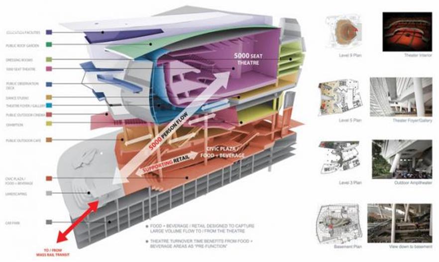 項(xiàng)目旨在成為一個(gè)充滿活力的城市節(jié)點(diǎn),可以容納5000名觀眾的文化劇院和一個(gè)以飲食為導(dǎo)向的零售區(qū)相輔相成。