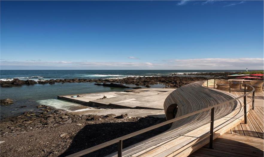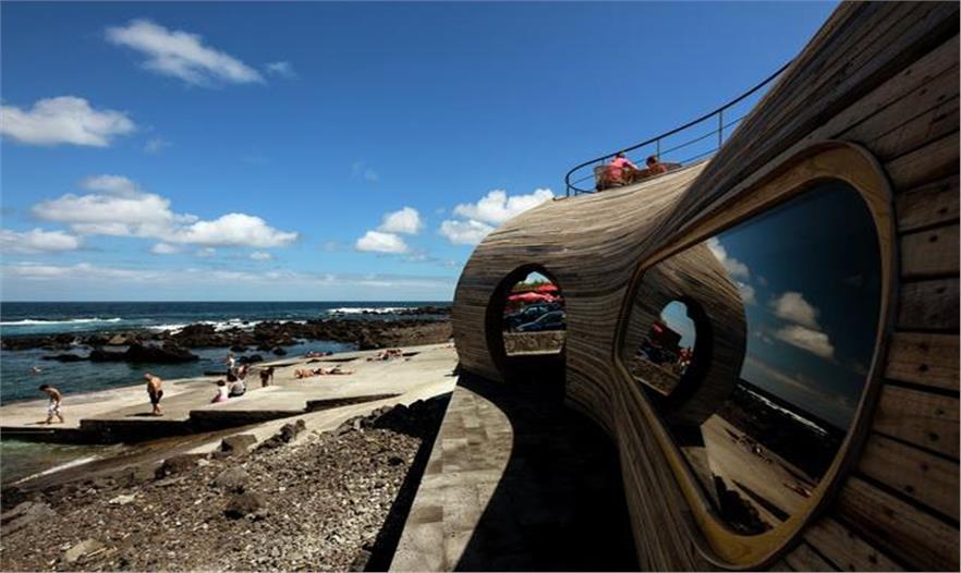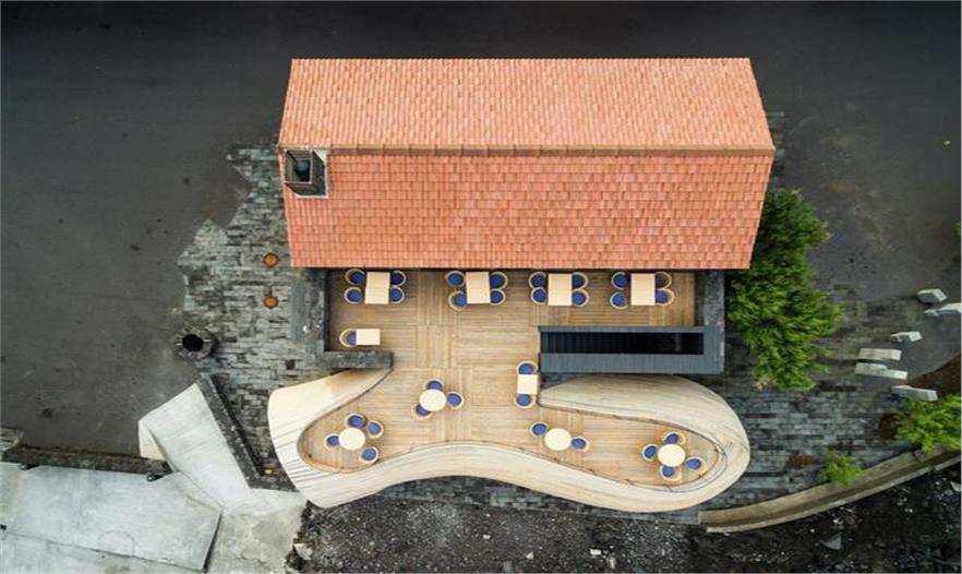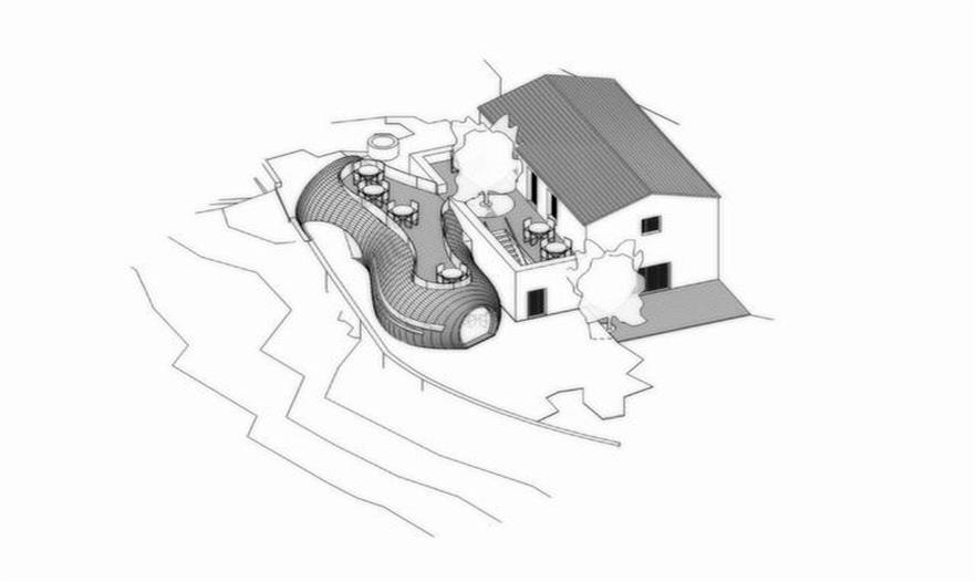 這是一個改擴建項目,一座位于葡萄牙馬達萊娜(Madalena)島上的廢棄多年的石頭屋被重新修繕,并新增加了一個有機形狀的流線木頭屋作為一處海景酒吧餐廳。餐廳與原有建筑緊密連接在一起,仿佛從石頭屋的陽臺上流下來后凝固的液體。來自FCC Arquitectura的設計師從周邊的環(huán)境中吸取靈感,從后面的分析圖可以看出,這座有著有機曲線的餐廳靈感來自海浪、鯨魚巖石和酒桶的結(jié)合。而其與后面歷經(jīng)滄桑的石頭屋形成強烈反差。