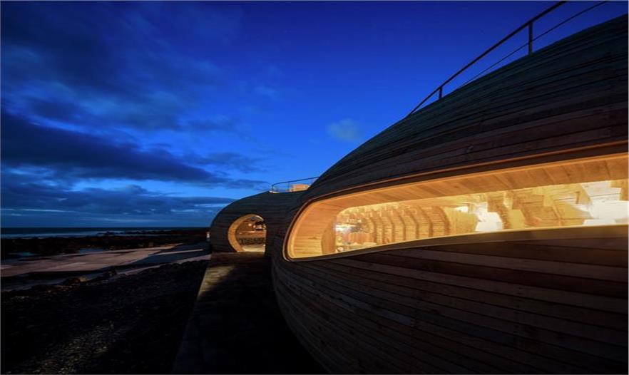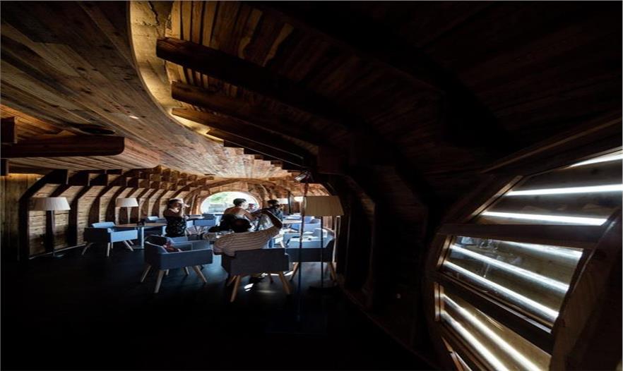 其內(nèi)部裸露的木結(jié)構(gòu)加上溫馨的燈光,讓人感到溫暖舒適,四下的木頭縫里仿佛滲透出淡淡酒香。眺望著遠處的海景品嘗著杯中的美酒、桌上的美食,想想也是醉了吧~