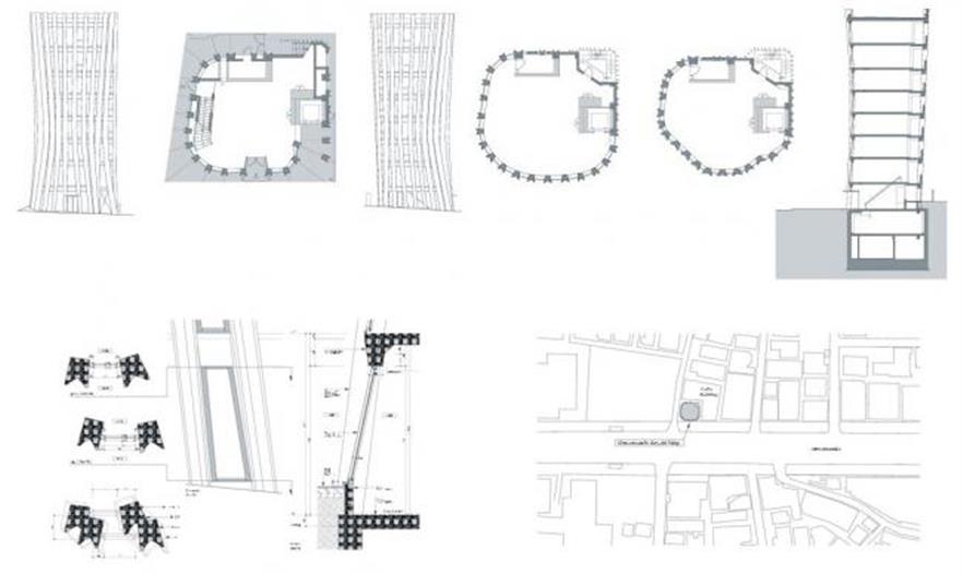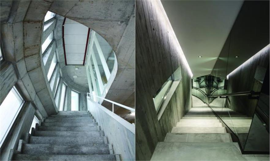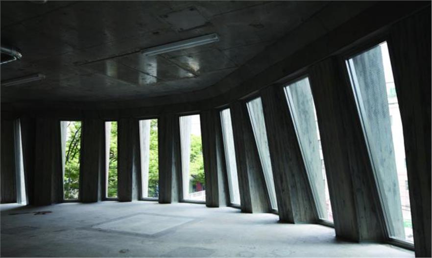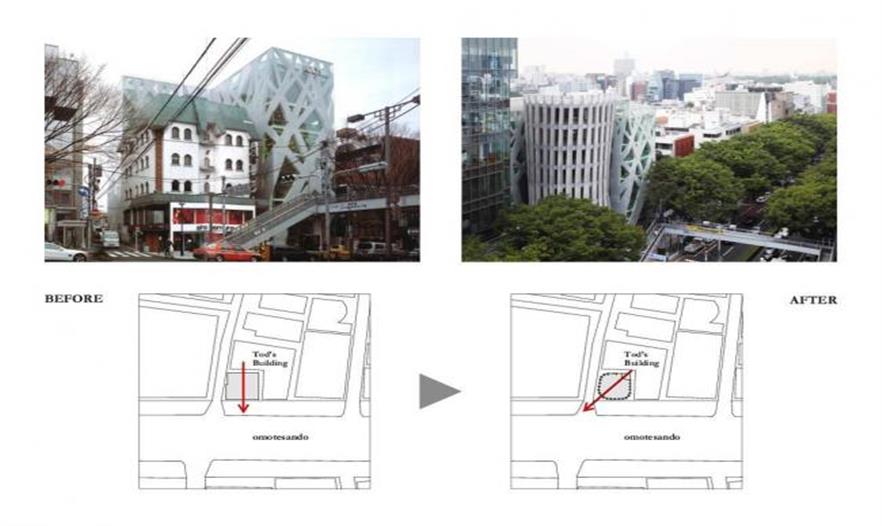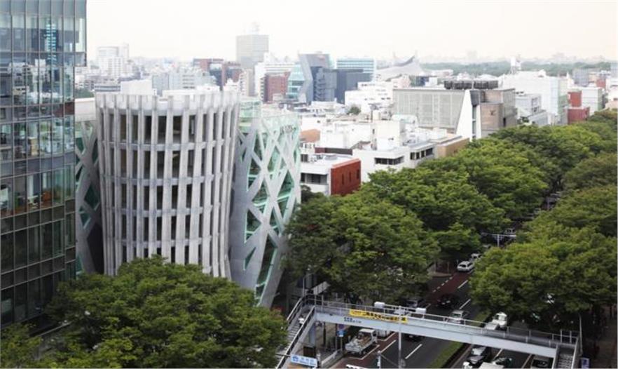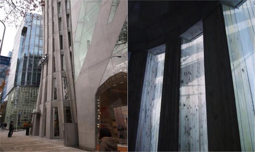 這座八層商業(yè)大樓位于日本東京表參大道的右側(cè)拐角處, 幾乎整個(gè)被Tod’s L-shaped Omotesando Building 包圍。這座大樓的前身的正門原本正對(duì)著表參道大道, 側(cè)面則對(duì)著一條小徑,極易被人們當(dāng)作是大樓的后面。因此,大樓嘗試與Tod’s building所在的位置形成一個(gè)不規(guī)則的環(huán)形, 即和Tod’s building斜對(duì)著。這樣設(shè)計(jì)是為了最大限度地?cái)U(kuò)充街角的空間,以此凸顯其近鄰的Tod’s building,正門垂直線條的設(shè)計(jì), 大樓的外側(cè)設(shè)計(jì)是加固的鋼化混凝土,其形像是多種縱列排列的扇葉狀。而其上的混雜木狀構(gòu)造則是將混凝土放入木制模具中而制成。