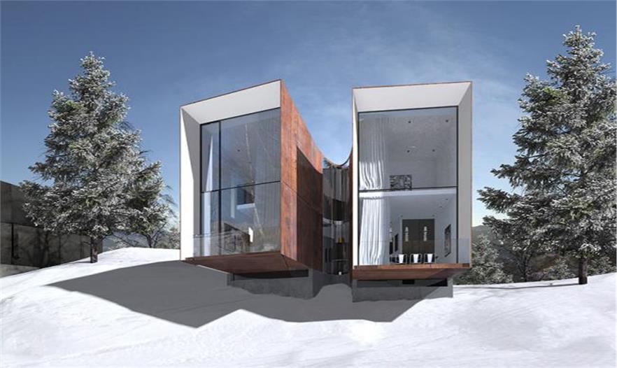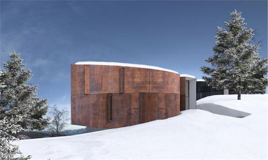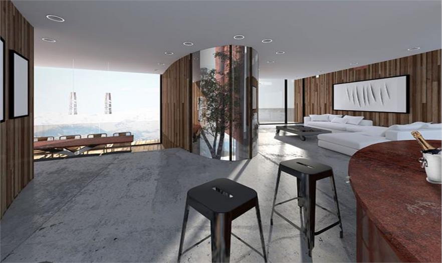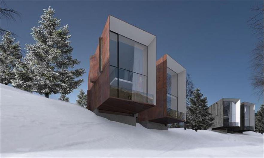 在“鳥(niǎo)巢”的規(guī)劃設(shè)計(jì)中,多個(gè)單體的滑雪屋組成一片建筑集群,在北面山坡上服務(wù)于7000多英畝的滑雪度假村。通過(guò)上山的道路可抵達(dá)鳥(niǎo)巢住所,在其中欣賞山下的風(fēng)景。每個(gè)住所由一個(gè)圓柱殼組成,并提供用戶日常需要的能量(自然光通過(guò)朝南的高大的窗戶和大天窗照耀室內(nèi))