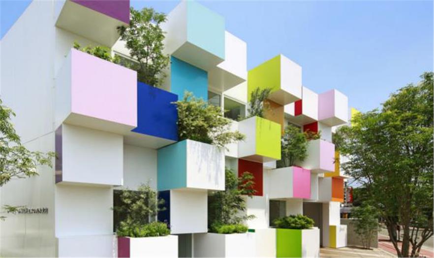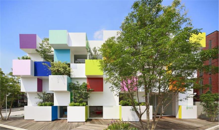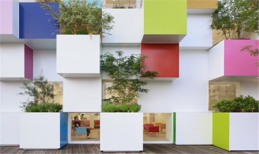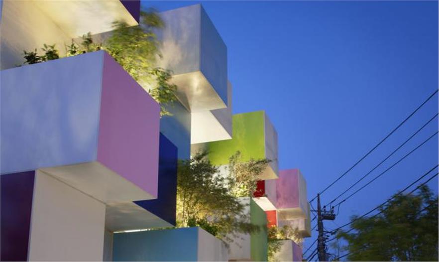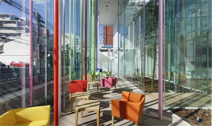 這家位于東京的分行已經(jīng)是一起合作的第四家,墻面像是由方塊積木拼成的,凹凸起伏,并配上了十多種不同的顏色,有些涂在正面,也有些涂在側(cè)面,像是跳進(jìn)人們的視線里。 墻面實(shí)際有 4 個不同的深度,像音樂盒一樣起落,凹進(jìn)去的地方安裝了窗戶。