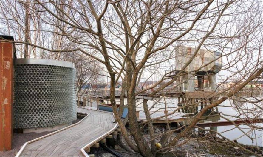 今年看到不少桑拿房設(shè)計案例,都有些特別,比如加拿大休倫湖 Sans Souci 島上像是海洋巖洞一般的桑拿小屋,以及挪威北極圈地區(qū)的 Sandhornøy 島上這座能夠同時容納超過 120 個人“蒸”的木質(zhì)桑拿房。 今天要介紹的這間桑拿房,更是有著一個奇怪的架構(gòu),銹蝕的鋼鐵外立面下隱藏著一個溫暖的內(nèi)飾。這間位于瑞典工業(yè)港口城市哥德堡的桑拿房是由柏林設(shè)計工作室 Raumlabor 與哥德堡當(dāng)?shù)鼐用颀R力設(shè)計建造的,位于 Frihamnen 港口區(qū)域,需要通過一座小型木橋才能抵達。