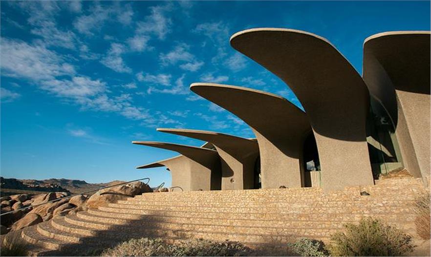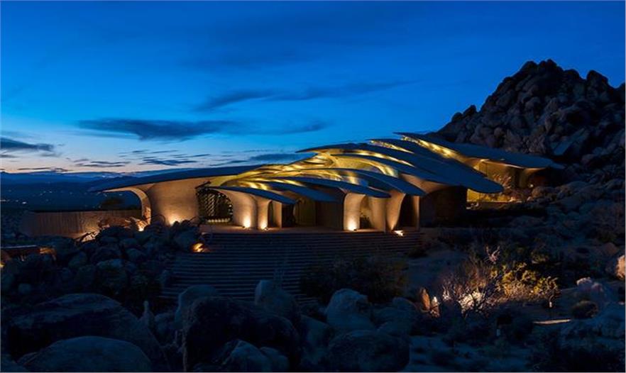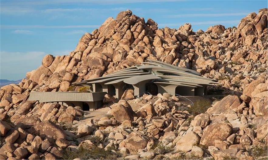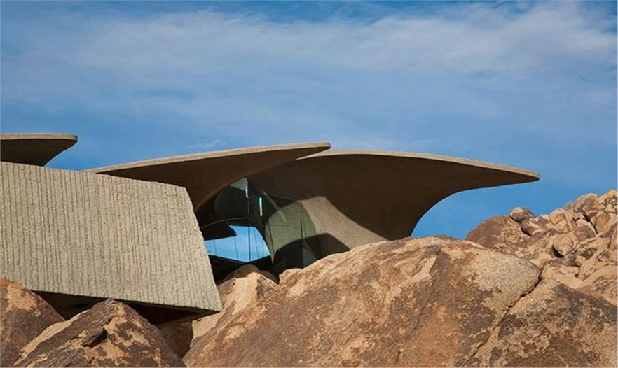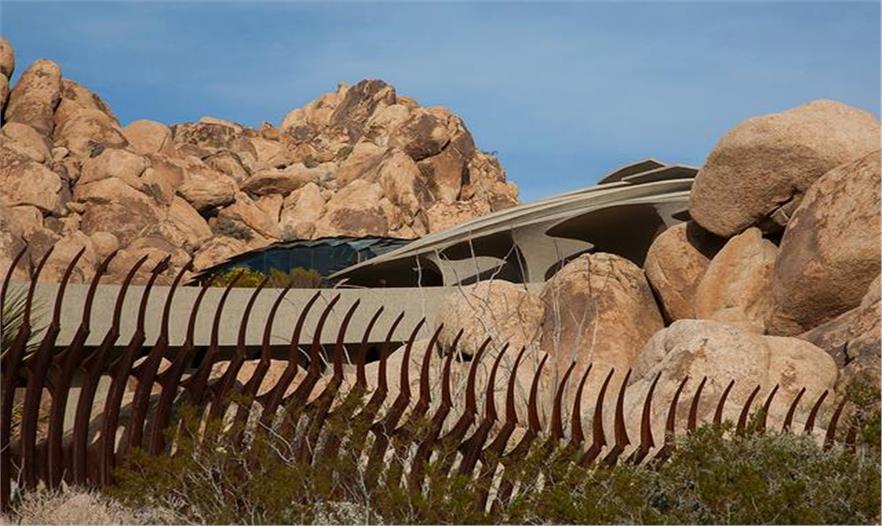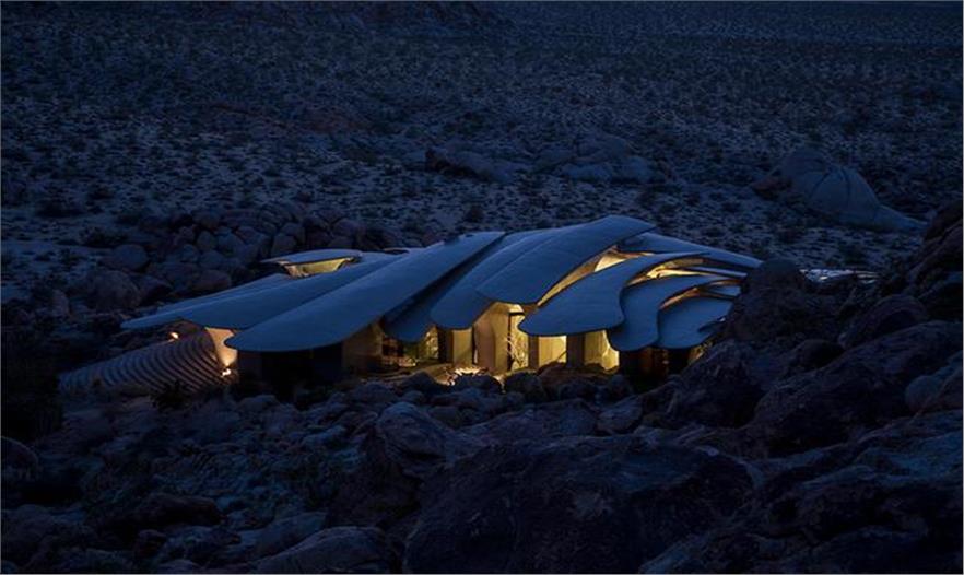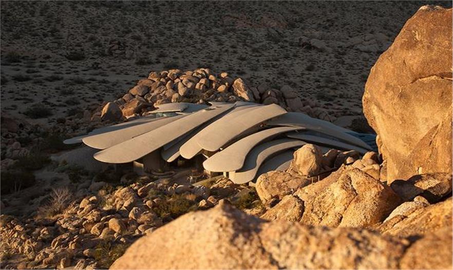 這座住宅名為Organic Modern Estate (有機(jī)現(xiàn)代莊園)。占地約10英畝,由美國(guó)當(dāng)代藝術(shù)家Doolittle夫婦委托建筑師Kendrick Bangs Kellogg設(shè)計(jì)。建筑由一片片的混凝土花瓣堆疊而成,這也是Kendrick Bangs Kellogg慣用的手法之一,與周圍寂靜蕭條的巖石和荒漠融為一體。內(nèi)部延續(xù)了外面的風(fēng)格,混凝土、石頭、玻璃與金屬等元素的組合搭配就像置身在一個(gè)現(xiàn)代化巖洞中,家具的形態(tài)與整個(gè)建筑協(xié)調(diào)一致。