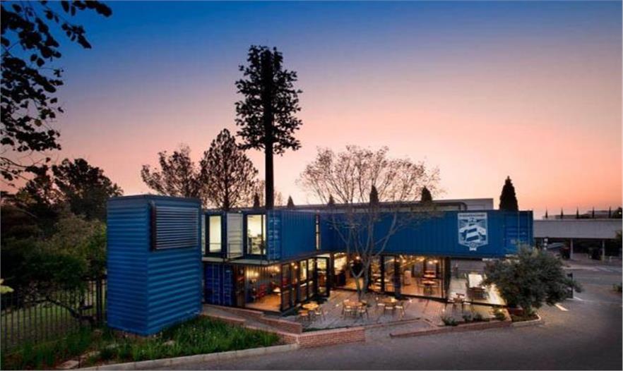盡管還談不上流行趨勢,集裝箱的熱度的確是有增無減。集裝箱被改裝成住宅、藝術(shù)空間、辦公室,甚至還有許多從城市出租屋搬離的人,合伙組建了由集裝箱構(gòu)成的村莊,稱之為“集裝箱托邦(containertopia)”?,F(xiàn)在,你還可以到集裝箱咖啡館里坐坐。 南非米德蘭的 Foghound Coffee 咖啡館就是一家用貨運集裝箱打造的咖啡館,由設(shè)計公司 Earthworld Architects 設(shè)計。它位于道路拐角處,遠遠望去,集裝箱外形頗引人注意。這家咖啡館是一座小型懸臂式建筑,二樓的結(jié)構(gòu)向外伸出,藍色集裝箱的金屬立面非常醒目。據(jù)設(shè)計師介紹,立面除了印上點名和咖啡館標識之外,完全保持集裝箱原來的印記。