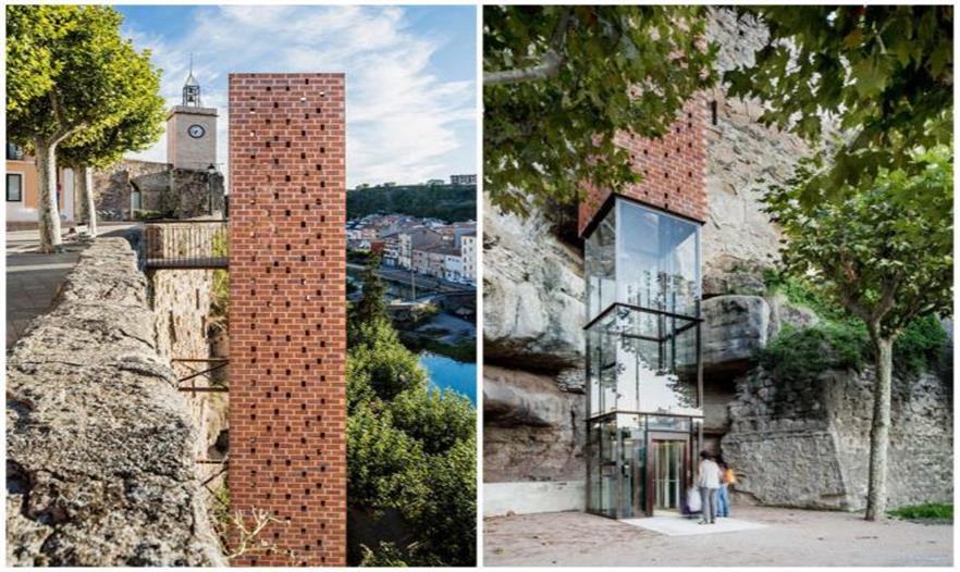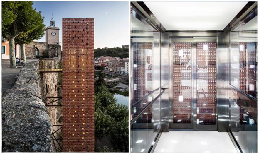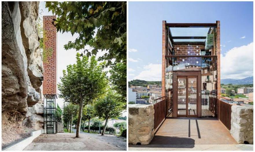 和很多城鎮(zhèn)一樣,巴塞羅那周邊小鎮(zhèn) Gironella 有河流穿城而過,河的一側(cè)是老城區(qū),另一側(cè)則是現(xiàn)代的新區(qū)。不過如果想從新區(qū)到舊區(qū),得爬上陡峭而不平整的臺階才能到達(dá)。這些年來,以河流為分界,Gironella 出現(xiàn)明顯的發(fā)展不平衡。新區(qū)地勢平緩而且更靠近巴塞羅那,發(fā)展得很快;而老城區(qū)盡管中世紀(jì)就建在這里,有許多歷史古跡,卻漸漸由于地勢高、不方便抵達(dá)而越來越少人前往,變得有些蕭條。 為了讓老城區(qū)重新熱鬧起來,也讓它不被現(xiàn)代社會“拋棄”,建筑師 Carles Enrich 在老區(qū)一側(cè)的河岸邊建了一個超過 20 米高的電梯,讓它成為連接新與舊的通道。