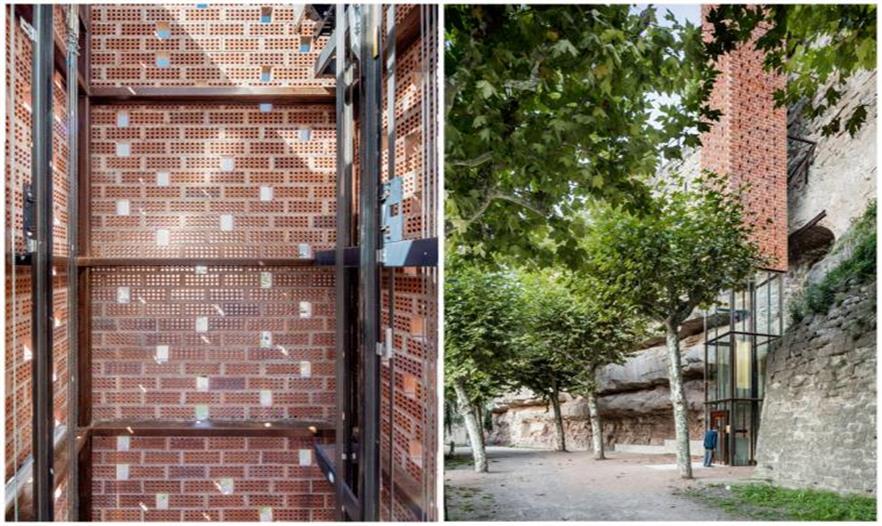 現(xiàn)在,腿腳不便的市民不需要攀爬臺階就能到達(dá)地勢更高的區(qū)域 盡管是個嶄新的設(shè)施,并且倚著斑駁的石壁而建,但這座高高的電梯卻不顯得突兀或違和。 這個項(xiàng)目用了紅色石磚、鋼和玻璃三種主要材料。細(xì)長的通道底層透明,上半部分(上面 16 米)則被紅磚包裹著。 本來,本地建筑就常用紅磚砌成,而這種暖色調(diào)、稍顯粗糙的建筑材料又不會太“現(xiàn)代”(想想大城市里那些會造成光污染的窗,或是平滑的白墻),所以用在這里正合適,幫助電梯通道融入周圍的景觀。 這些磚塊都帶著孔眼,這是考慮其透光性。白天有自然光灑入、更加明亮(但又不會太曬),晚上燈光通過孔洞透出去,也方便來往經(jīng)過或者需要使用電梯的人。