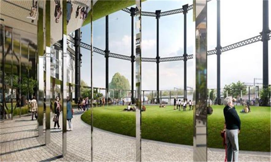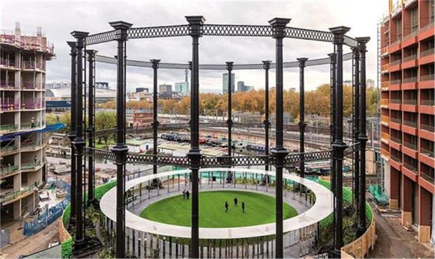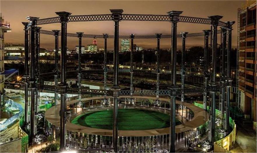 其實,公園的金屬結(jié)構(gòu)已經(jīng)有超過 150 年歷史了,它是從原址上的八號煤氣站(Gasholder No.8)保存下來的架構(gòu),當(dāng)時倫敦最大的煤氣廠潘克拉斯煤氣廠(Pancras Gasworks)在這里生產(chǎn)和儲存煤氣?,F(xiàn)在,八號煤氣站已經(jīng)被列為英國二級保護(hù)建筑。這些結(jié)構(gòu)曾經(jīng)被暫時拆遷到英格蘭北部的約克郡,而為了配合 King’s Cross 改建計劃,它們又回到倫敦,重新豎立。