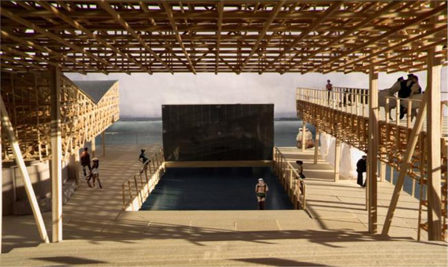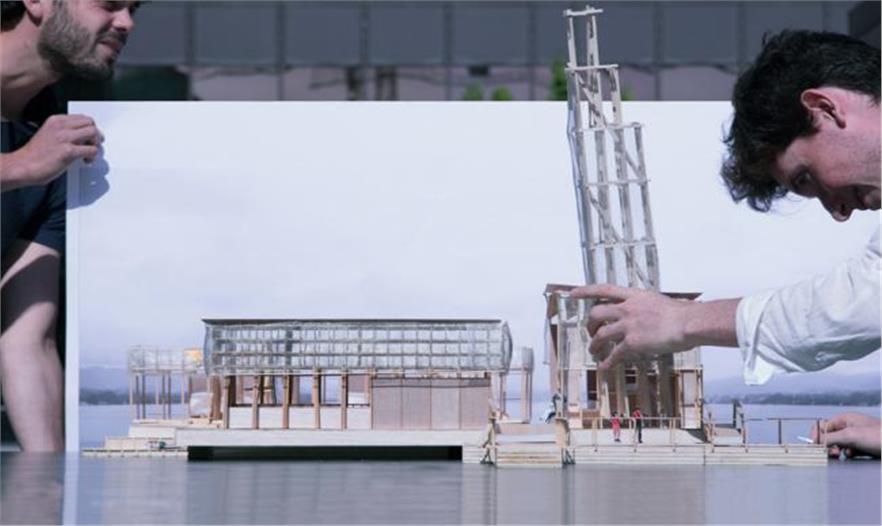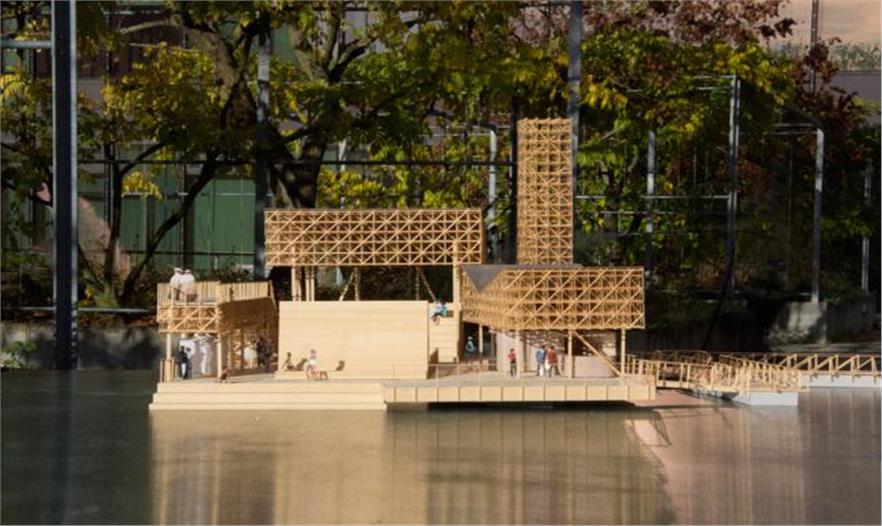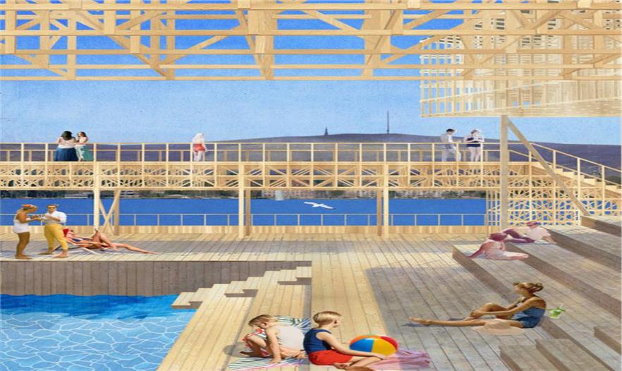 該結(jié)構(gòu)的設(shè)計(jì)滿足了策展人christian jankowski的呼吁,他曾呼吁學(xué)生們設(shè)計(jì)一個(gè)小屋,要集LED顯示屏、游泳池、觀眾席和酒吧于一體。學(xué)生們經(jīng)過一番競爭之后,那些最好的點(diǎn)子得以被篩選出來進(jìn)行改進(jìn)實(shí)施。除了設(shè)計(jì)思路外,建造手段也將會(huì)對(duì)最終的效果起到重要的影響,那就是它就會(huì)采用全木材料進(jìn)行建造。對(duì)于許多學(xué)生來說,該項(xiàng)目是他們第一次有機(jī)會(huì)將自己的設(shè)計(jì)變?yōu)楝F(xiàn)實(shí),設(shè)計(jì)階段結(jié)束之后,各種零件的預(yù)制將會(huì)在蘇黎世附近的一個(gè)飛機(jī)庫里進(jìn)行,這個(gè)過程也由學(xué)生們完成,然后零件會(huì)在2016年春季被運(yùn)到湖上進(jìn)行組裝。