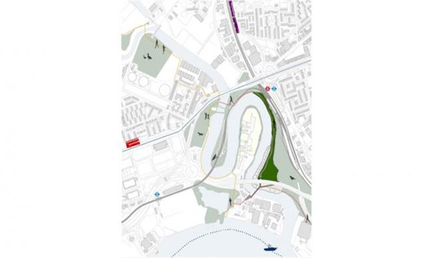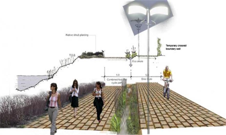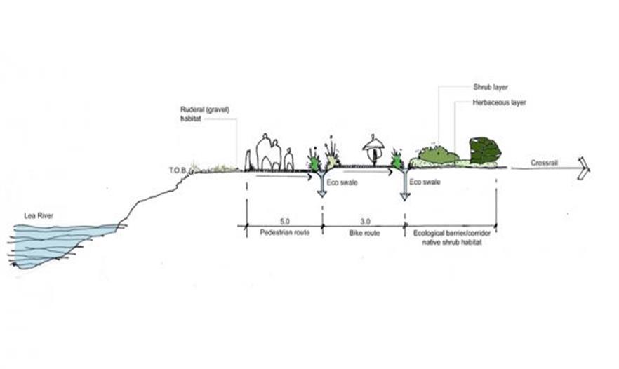 這個(gè)濱河路線將基于嚴(yán)格的可持續(xù)發(fā)展的原則設(shè)計(jì),設(shè)置現(xiàn)場(chǎng)排水系統(tǒng),提供野生動(dòng)植物走廊,同時(shí)保留河岸的完整性。該河流邊緣雜草叢生的棲息地會(huì)被修復(fù),并與Crossrail城建工程協(xié)商利用綠墻取代臨時(shí)的圍欄。這個(gè)改善新的多功能市區(qū)的方案將之前分離的區(qū)域連接起來,并與相鄰的交通中心連接起來。