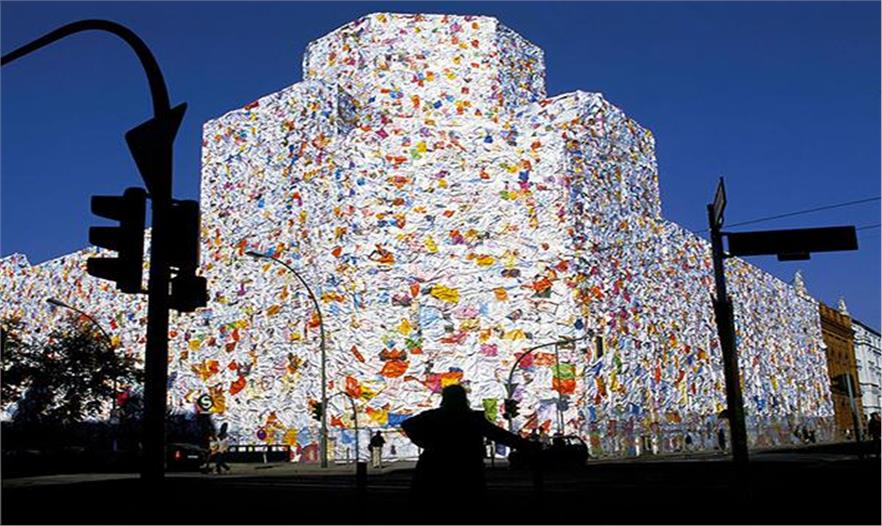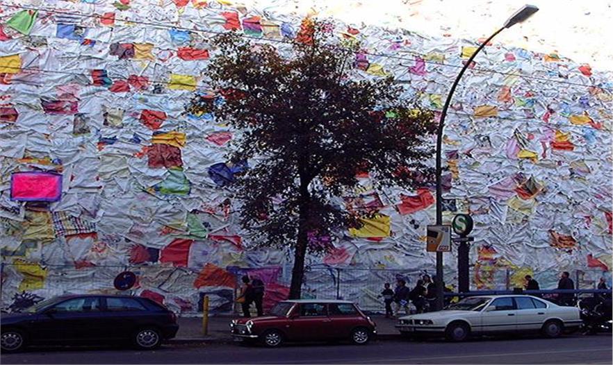 德國(guó)概念藝術(shù)家HA Schult經(jīng)常以別人的垃圾為原料創(chuàng)作一些大型的新概念的裝置藝術(shù)作品,旨在用日常生活中的垃圾來關(guān)注西方社會(huì)的大量消耗。他曾經(jīng)用大量的生活垃圾創(chuàng)造了數(shù)百個(gè)“垃圾人”,而如今他又用收集來的35000封超大張的情書貼在了德國(guó)柏林老郵局的外墻上。這些情書們五顏六色的張貼在墻上散發(fā)著愛的信號(hào),而被愛的對(duì)象不僅僅是戀人,還有親人,朋友甚至是一個(gè)寵物。這個(gè)舉動(dòng)引起了市民們的廣泛回應(yīng),也拉近了人們之間的關(guān)系。