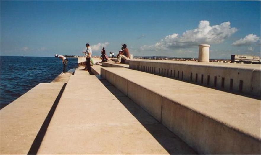 這個(gè)海風(fēng)琴屬于扎達(dá)爾海岸的重建計(jì)劃。二戰(zhàn)后,這座克羅地亞海濱城市建筑與公共設(shè)施遭到不同程度的損毀。當(dāng)時(shí)扎達(dá)爾也進(jìn)行過(guò)一次城市修復(fù)建設(shè),但由于節(jié)奏急、規(guī)模大而無(wú)秩序,濱海區(qū)一帶最終只建起了一面混凝土墻而已。直到 2005 年 Nikola Baši? 完成重新設(shè)計(jì)與修復(fù),這里漸漸才變成現(xiàn)在的樣子,更加熱鬧了。