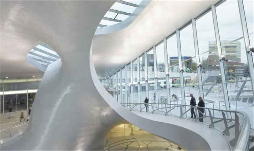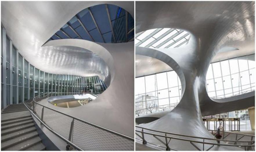 換乘大廳高 60 米,面積達(dá)到 1.8 萬(wàn)平方米。這個(gè)大體量空間展現(xiàn)出常見(jiàn)于 UNStudio 各個(gè)項(xiàng)目的特點(diǎn):強(qiáng)調(diào)曲線和流動(dòng)。建筑師沒(méi)有選擇傳統(tǒng)的建筑結(jié)構(gòu),而是用扭曲的墻體和屋頂營(yíng)造出一種戲劇化的效果,大廳內(nèi)的天花板、墻體和地面都連接在了一起。 據(jù)說(shuō),這個(gè)設(shè)計(jì)受到德國(guó)數(shù)學(xué)家菲利克斯·克萊因提出的“克萊因瓶”啟發(fā)??巳R因瓶有點(diǎn)像莫比烏斯環(huán),它是個(gè)扭曲、閉合的曲面,沒(méi)有邊,表面也不會(huì)終結(jié)。另外,建筑師還以更輕的鋼鐵來(lái)代替了混凝土,而且建造方法是用在造船上的方法,這在過(guò)去同樣規(guī)模的建筑上是從未有過(guò)的。