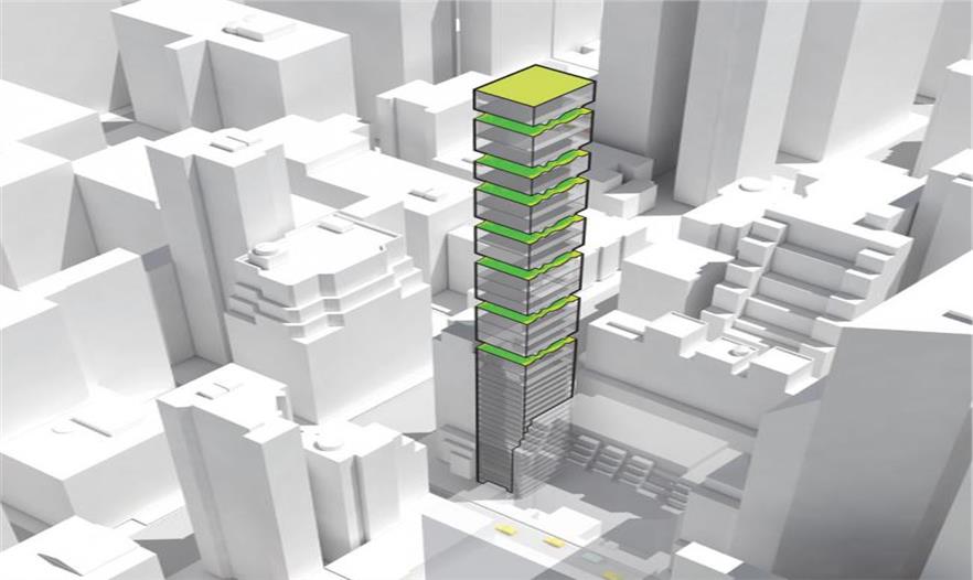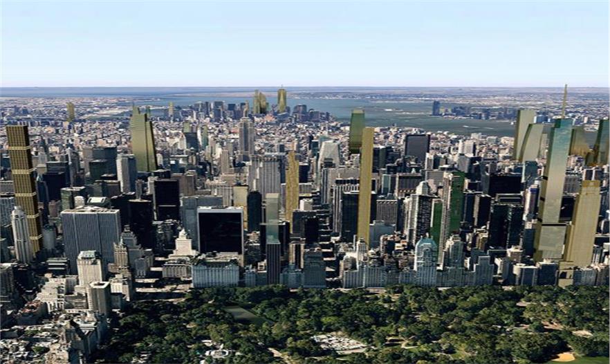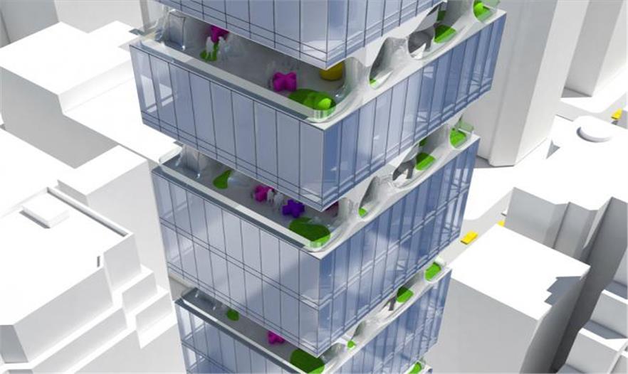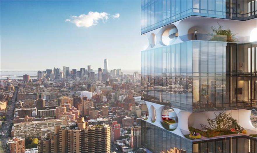 這棟41層高的玻璃幕墻大樓將建在在曼哈頓的市中心,住宅樓上半段的特點就在于每兩到三層之間就會有一個16英尺高(合4.8米)的“空隙”,這段“空隙”就是露天平臺打造的花園。