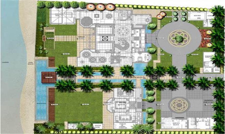 這個住宅建筑的景觀設(shè)計以古典的摩洛哥花園為原型設(shè)計。其風(fēng)格在開放和封閉庭院之間轉(zhuǎn)化,其中貫穿著水景,與金色和赭色的建筑相映襯。這個概念的關(guān)鍵元素是整個項目建在俯瞰海洋的人造湖上,還包括一個靜謐的私人海灘。