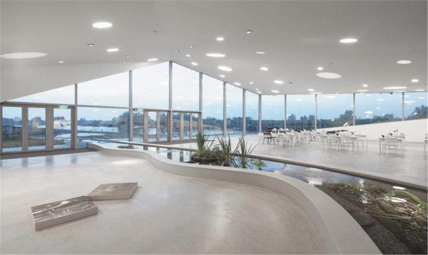 博物館就地取材,不僅僅體現(xiàn)在能量供應(yīng)和污水處理上,還同樣體現(xiàn)在當(dāng)?shù)匚⑨劜蛷d的菜單上。博物館的工作人員很多是過去在Biesbosch工作過的志愿者。甚至承建商和工人也大都來(lái)自附近地區(qū)。Biesbosch有豐富的采摘和加工自然材料的歷史。新建筑中的博物館的藝術(shù)空間,全部使用當(dāng)?shù)爻霎a(chǎn)的自然材料。上世紀(jì)中葉,嚴(yán)重的污染使鱘魚和鮭魚從該水域消失。Haringvliet閘口建成,水質(zhì)變得干凈之后,這些物種又重新回到了此處,餐廳內(nèi)池塘的設(shè)計(jì)就是在隱喻這一點(diǎn)。