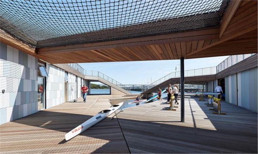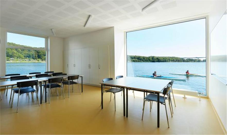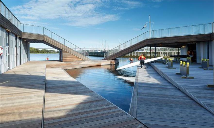 兩個體量,一個給用戶,另一個則是為皮劃艇,圍繞中央水區(qū)域創(chuàng)建一個庭院,給予用戶充分利用直航航線到峽灣。中央水區(qū)域加強了交流和俱樂部感。