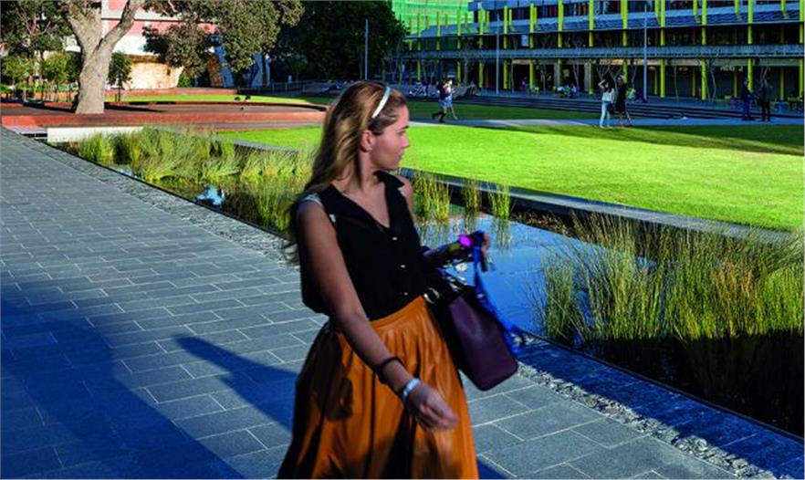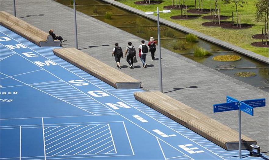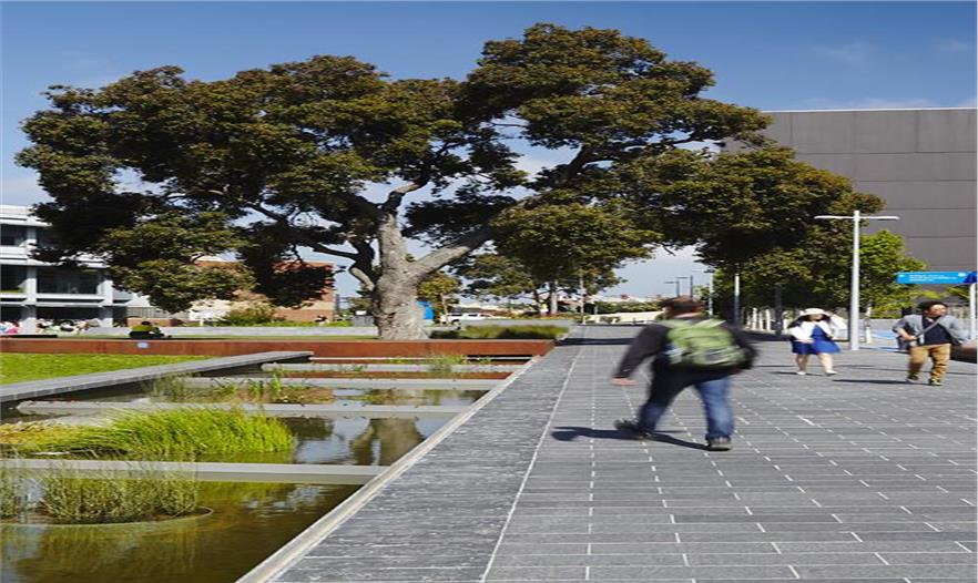 莫納什大學(xué)考菲爾德校區(qū)的景觀設(shè)計項目將之前令人混亂的道路和停車場改造成一條寬闊的林蔭道和水景,讓人產(chǎn)生真正來到校園的感覺。中央水景進行雨水處理和捕獲,講述莫納什大學(xué)對水敏感性城市的開創(chuàng)性研究,代指該區(qū)域作為濕地的時代。