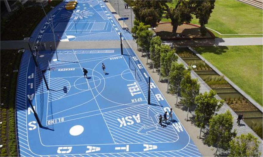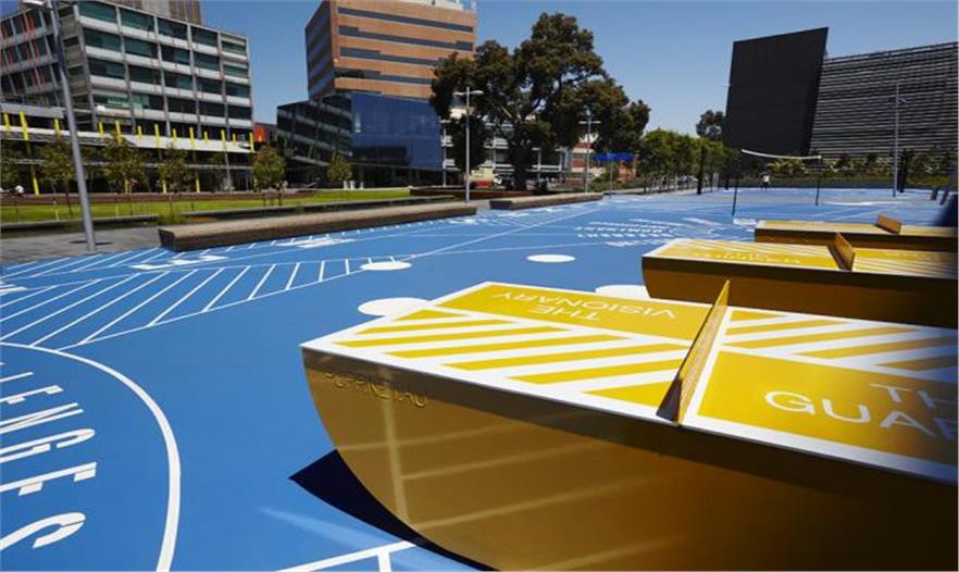 TCL事務(wù)所的設(shè)計重點包括一個新的稍稍下沉的草坪,作為全年活動的平臺以及為校園外繁忙的道路系統(tǒng)提供綠色喘息的機會;一個精致的甲板臺地,帶有咖啡桌椅,進行靜態(tài)的戶外活動;甲板區(qū)域內(nèi)還有藍花楹樹,產(chǎn)生斑斕的陰影以及作為該校園的特色;以及一個顯著的藝術(shù)品,為校園未來的發(fā)展規(guī)劃提供藍圖。