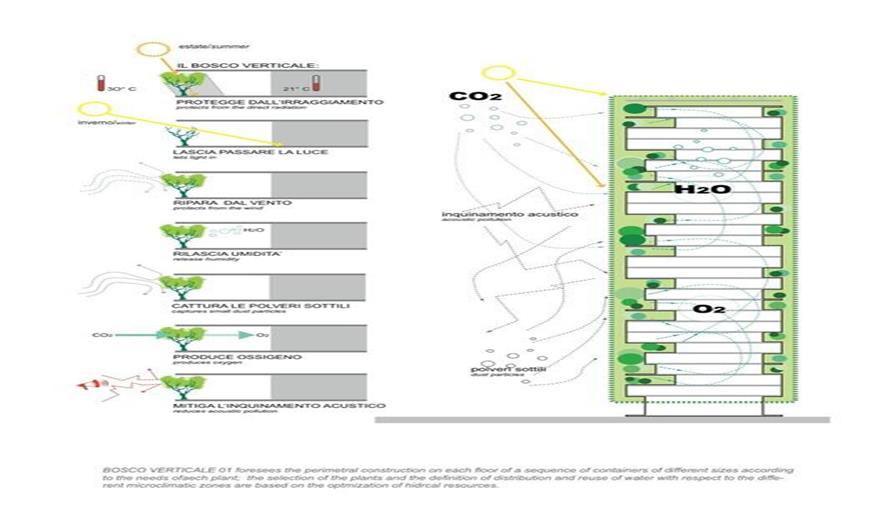 垂直森林幫助建立了微氣候,可以過濾城市環(huán)境中的微小粒子。植物的多樣性可以幫助建立微氣候來加濕、減少二氧化碳和微粒,生成氧氣并且對抗輻射和噪音污染。