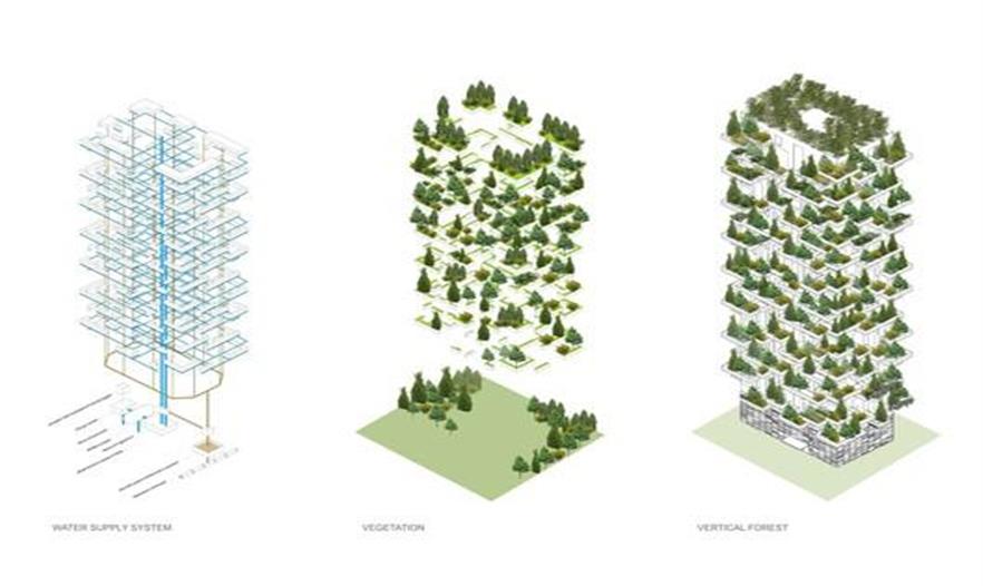 這是兩棟高層住宅樓,這兩棟住宅樓的建設(shè)成為將建筑和自然元素相結(jié)合的又一典范,同時(shí)有助于增加城市生物多樣性。這兩棟樓高度分別是110米和76米,樓梯四周從下至上建了相互錯(cuò)列的混凝土陽臺,這些陽臺就作為種植樹木的苗圃,里面種植了超過900株成年樹木,灌木等植物。