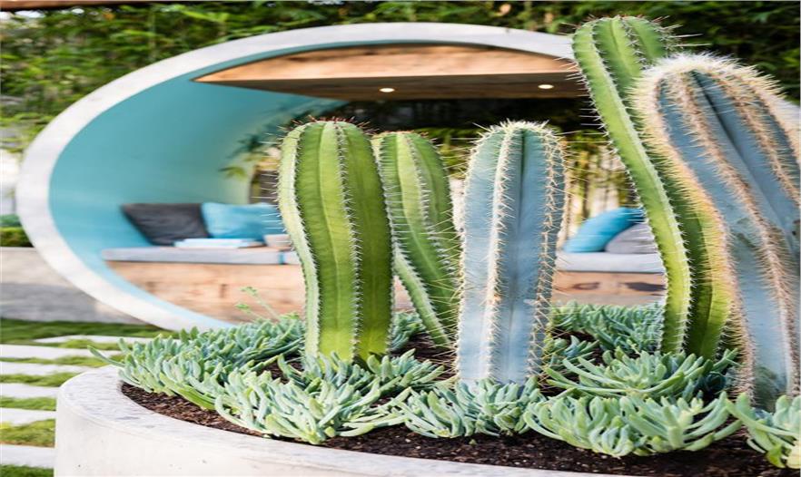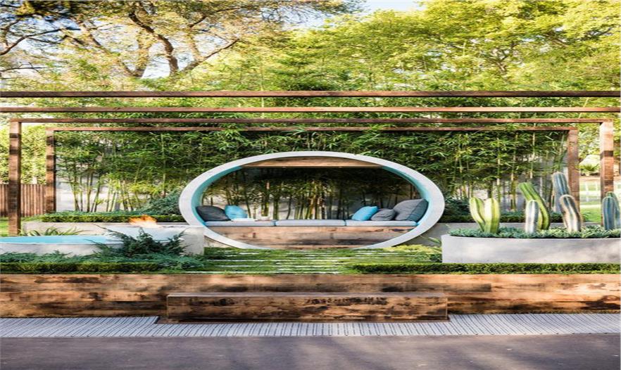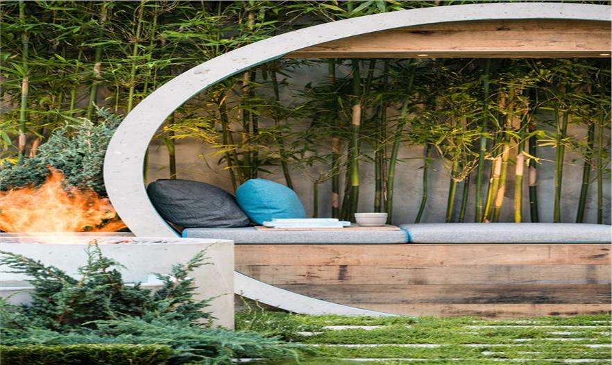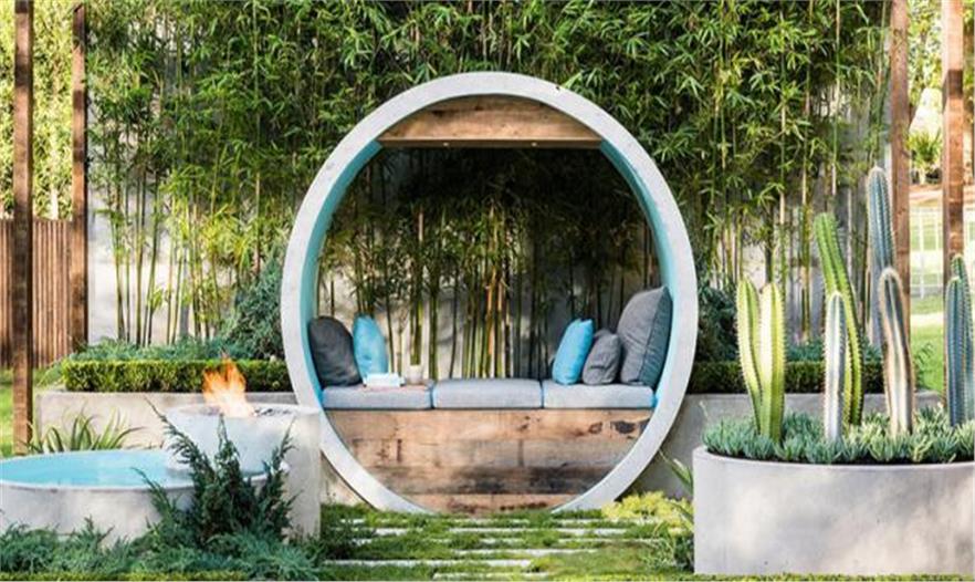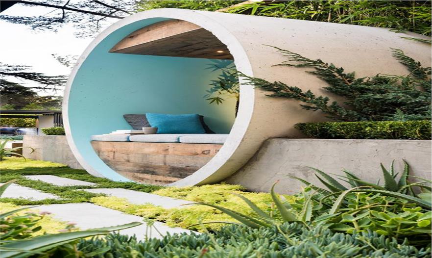 艾莉森使用了許多混凝土管進行設(shè)計,建造出冥思的月牙門、沙發(fā)床、水景和壁爐。設(shè)計師選擇的植物建造出一個四季花園,全年都有色彩、形狀和圖案。