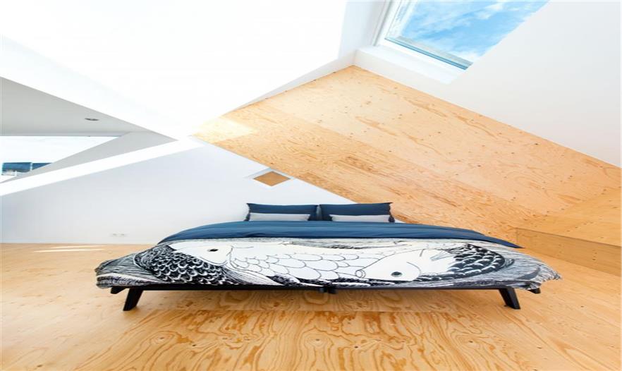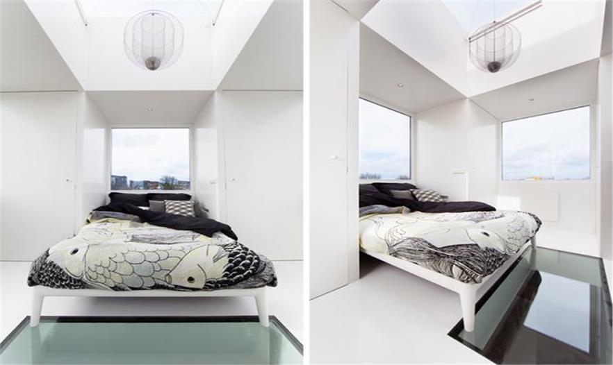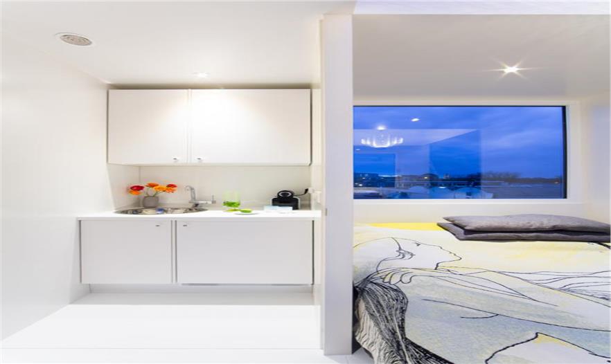 設(shè)計(jì)師將一個(gè)長(zhǎng)方形的谷斗轉(zhuǎn)變成前港區(qū)一個(gè)新型、奇特的地標(biāo)建筑。套房里面是全白的,每邊有一個(gè)大型的窗戶(hù),地面上也有一個(gè)窗戶(hù)。