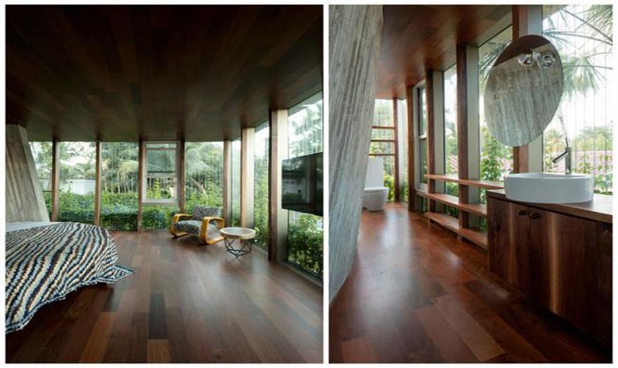 住宅的二樓是間臥室,整層樓用了落地玻璃,光照很充足,往外望去也是一片綠意盎然的。彎曲的墻和臥室的大床合在一起,組成了一個(gè)圓。這個(gè)墻還起到分隔作用,背后是廚房與浴室。