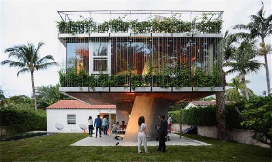 陽(yáng)光燦爛的邁阿密海邊新落成了一座造型獨(dú)特的房子。它像一棵樹(shù),扭曲的墻體是主干,二樓有個(gè)懸挑的大臥室,玻璃窗上爬著藤蔓植物,形成繁茂的樹(shù)冠;而它的四周,也被茂密的棕櫚樹(shù)包圍。這不是建筑師 Christian Wassmann 心血來(lái)潮設(shè)計(jì)的怪房子,而是他的客戶調(diào)皮地提出了造一座“樹(shù)屋”的要求。