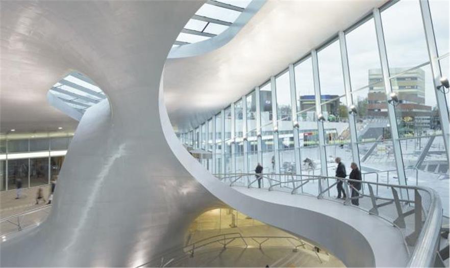 換乘大廳高 60 米,面積達(dá)到 1.8 萬平方米。這個大體量空間展現(xiàn)出常見于 UNStudio 各個項目的特點:強(qiáng)調(diào)曲線和流動。建筑師沒有選擇傳統(tǒng)的建筑結(jié)構(gòu),而是用扭曲的墻體和屋頂營造出一種戲劇化的效果,大廳內(nèi)的天花板、墻體和地面都連接在了一起。 據(jù)說,這個設(shè)計受到德國數(shù)學(xué)家菲利克斯·克萊因提出的“克萊因瓶”啟發(fā)??巳R因瓶有點像莫比烏斯環(huán),它是個扭曲、閉合的曲面,沒有邊,表面也不會終結(jié)。另外,建筑師還以更輕的鋼鐵來代替了混凝土,而且建造方法是用在造船上的方法,這在過去同樣規(guī)模的建筑上是從未有過的。