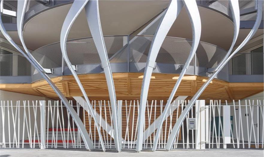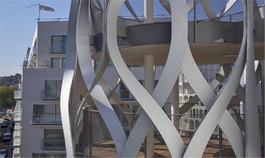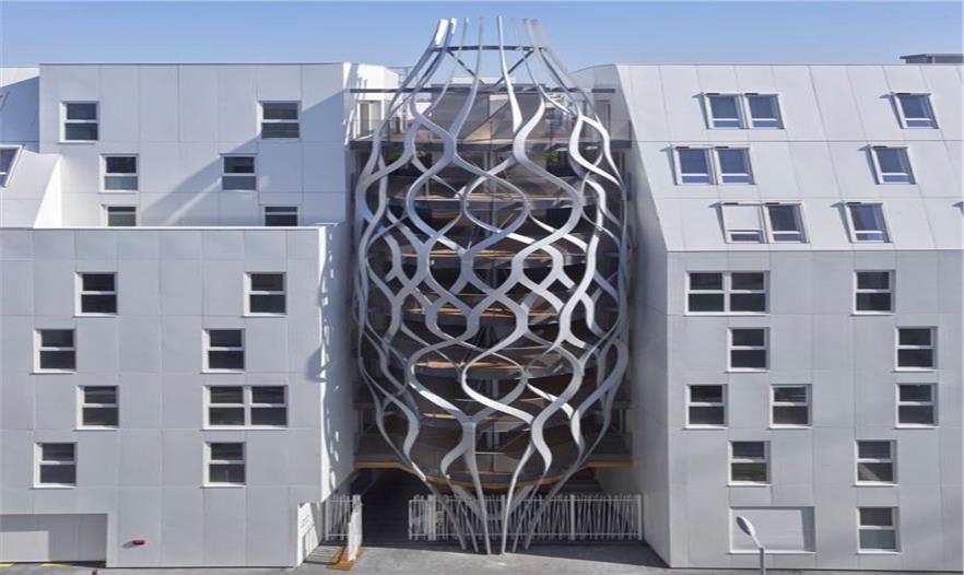 臨街的一幢是一排 7 層樓的白色建筑,建筑之間連接了具有雕塑感的金屬網(wǎng)格,鋁制材料相互交織,像一簇火焰或者塔樓。